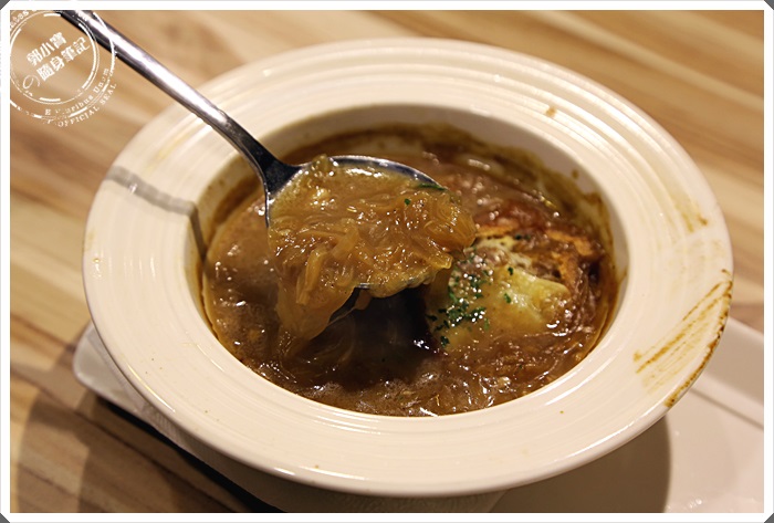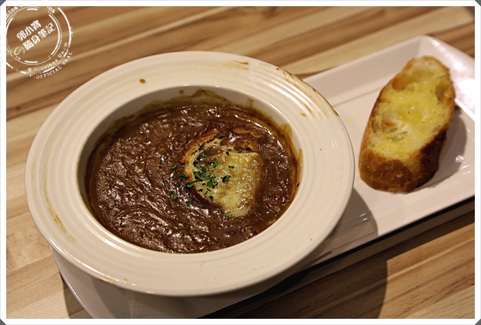 相當濃郁的一碗洋蔥湯,很少可以喝到那麼令我滿意的湯品,滿滿的洋蔥每一口都是幸福跟滿足,那濃郁的味道撲鼻而來接續的入喉的醇厚感,湯品中的法式麵包浸濕變得相當的軟口,法式麵包中還夾著一片焗烤起司增加咀嚼的口感及香氣。 |