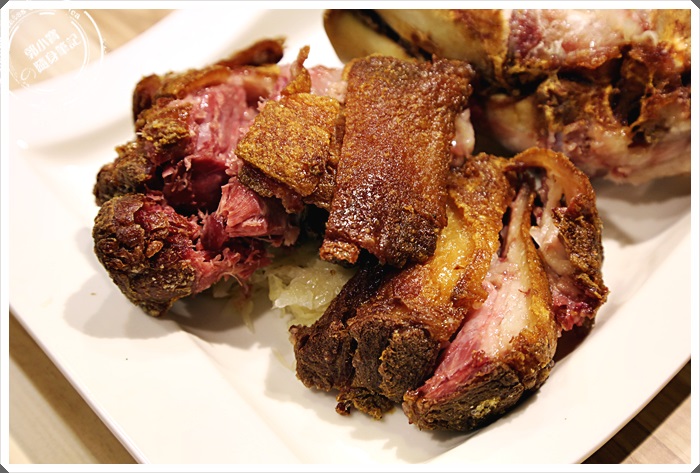 因為他們家的醃料真的超特別的,先將豬腳醃漬過後在下去蒸,入炸鍋把表皮炸成金黃色就起鍋,所以肉還是很嫩以外,皮跟肉中間的油脂還保持著黏牙及呼口,腿入咀嚼過後可以品嘗到醃漬的味道慢慢在嘴裡散發出來,那味道真的很像流水席上的烘肉的味道,我好喜歡這樣的組合。 |
