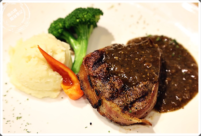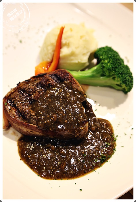 炭燒的條紋看起來相當的漂亮,因為是法式的作法所以就先把醬淋在牛排上了,醬汁帶點苦味增加了許多豐沛的口感,菲力牛肉的部分當然就是相當的嫩,但是菲力的油花本身就比較多,所以搭配著醬汁還滿順口的! |
