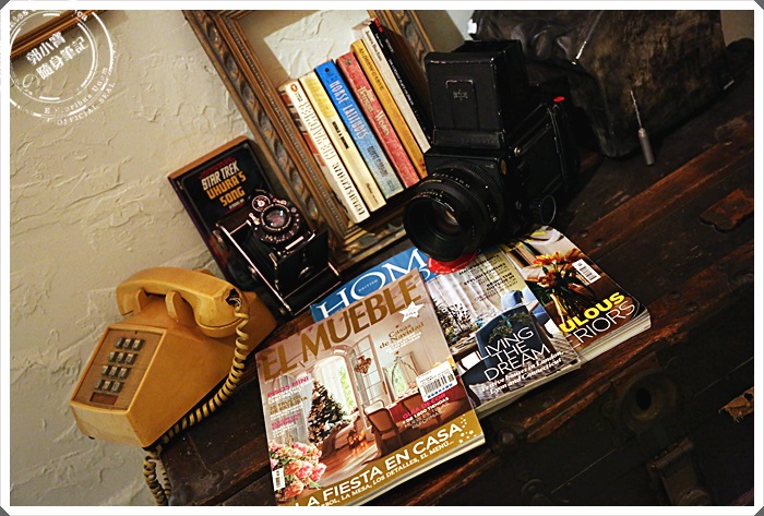 沿著後面的樓梯準備上二樓的時候,看到樓梯轉角桌子上放著老舊相機的裝飾物,令我訝異的停下腳步把玩一番。 |