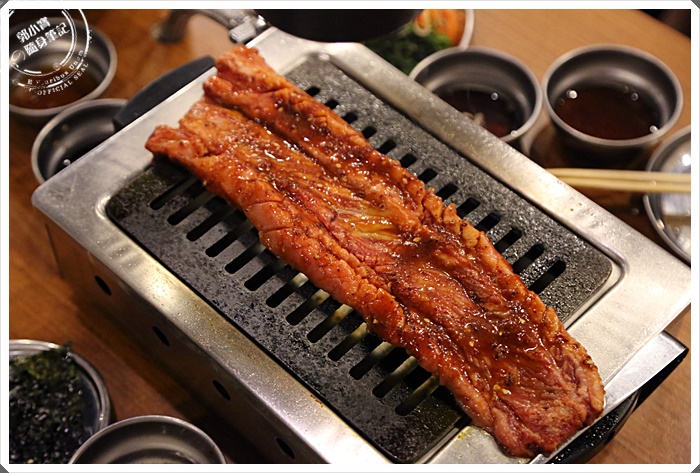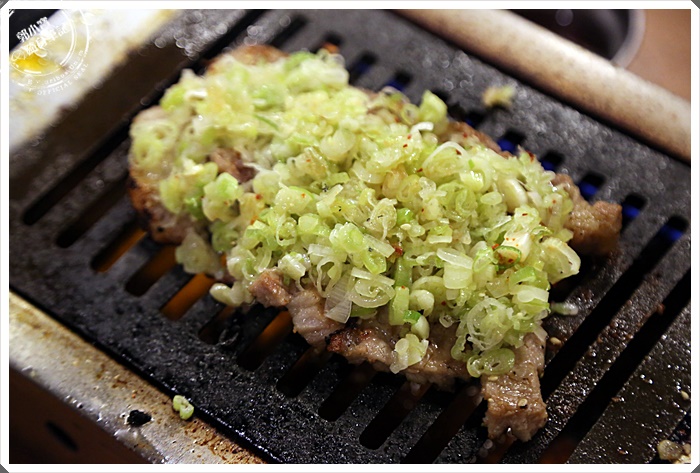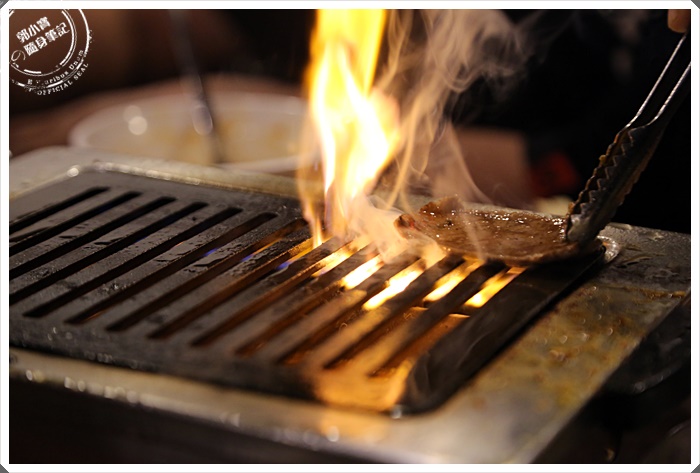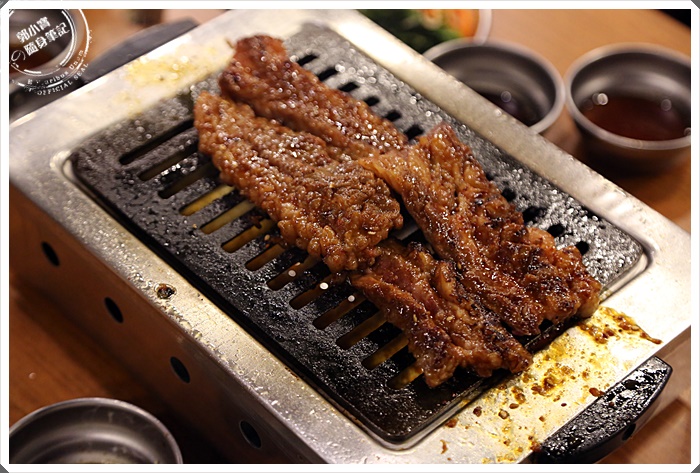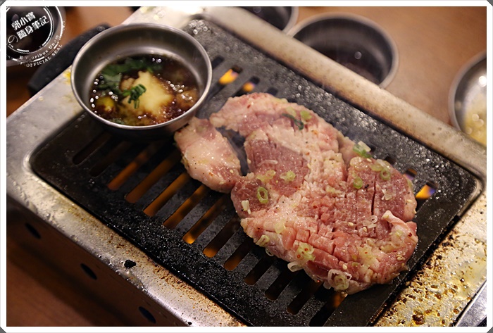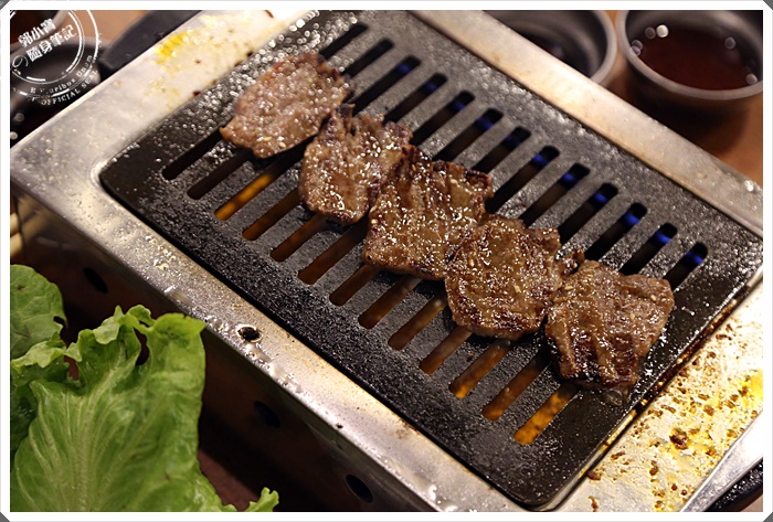 放上烤爐後馬上滋滋作響,我喜歡這種地等待時光,看著血水與醬汁融合浮出,再放進嘴巴裡的那個極致美味,這一塊油花滿夠的,吃起來軟嫩有餘。 |