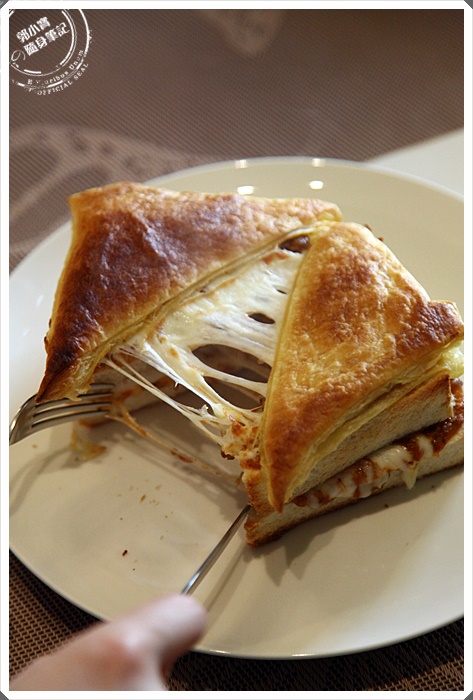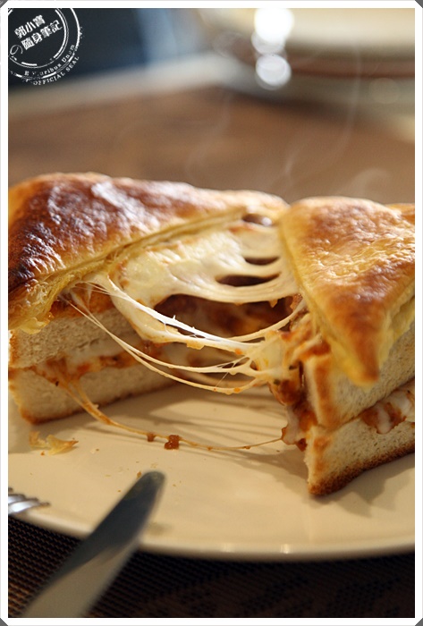 切開後可以看到最上層的起司牽絲融化的模樣,吐私是厚片土司,中間夾著番茄肉醬,一口咬下相當的有滿口感,最上層的酥皮加上鬆軟的吐司,中間的肉醬鹹酸滋味搭配起司超搭,有點濕潤感浸濕了吐司相當的美味,重點要趁熱吃最美味。 |