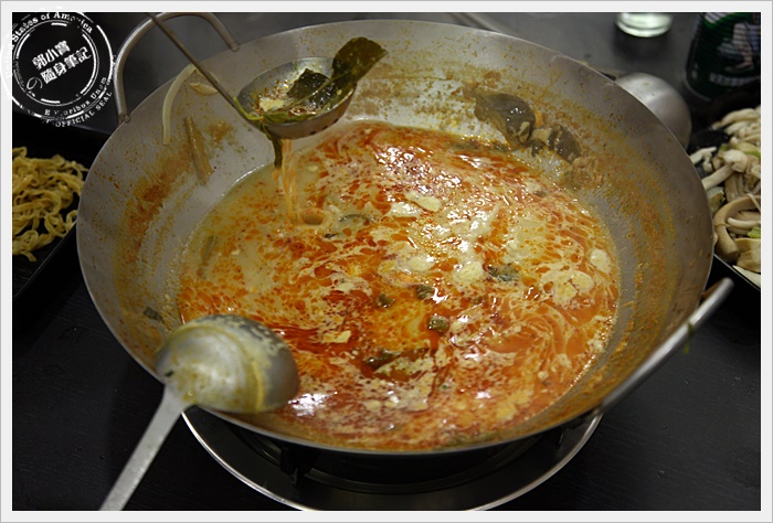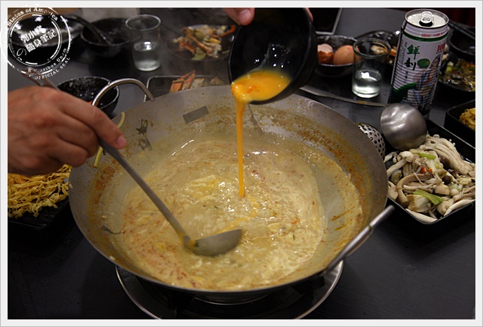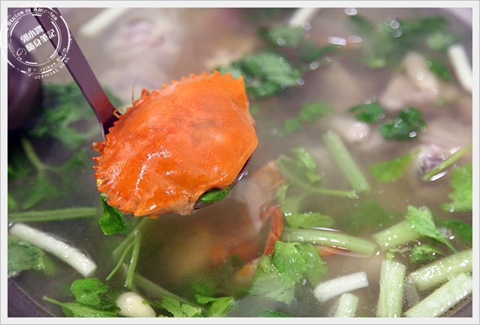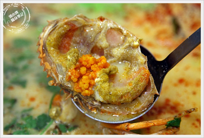 因為我們這一行人大約7個人,所以一開始我們就點了兩個鍋來比較一下,香辣雞煲蟹的湯頭有點像是新加坡的叻沙口味,忘了跟大家報告,雞煲蟹的每隻紅蟳的蛋都很多,簡直超划算的。