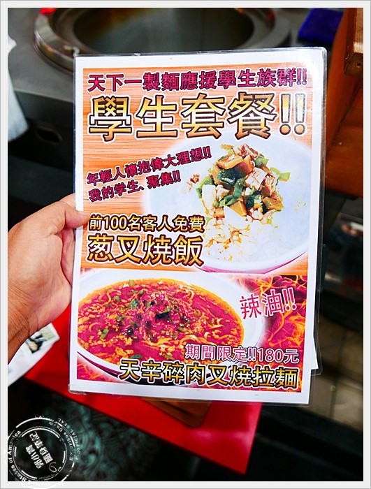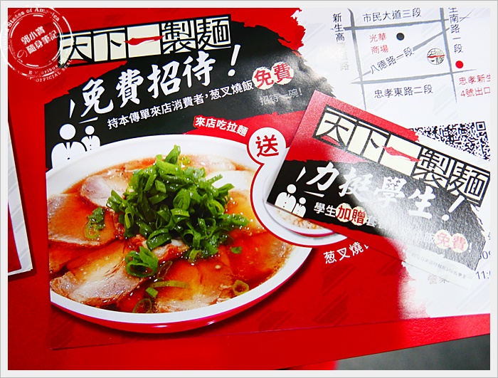 天下一製麵除了大概是來台灣價位比較平實的一間拉麵店以外,對學生還特別的好,除了有套餐的選擇以外,還有前100名客人贈送的蔥叉燒飯。 |