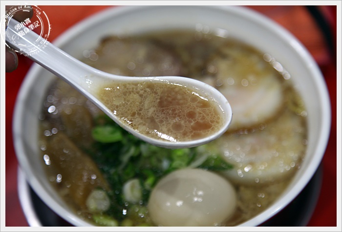 喝了一口湯頭醬油是屬於台灣人比較喜歡的甜味,日本醬油拉麵大多喜歡都帶苦味,但是天下一挑選的日本醬油是京都伏見的百年醬油廠,屬於甜味醬油,喝起來挺甘口,頗適合台灣人,難怪那麼多人都常常來吃,背脂的濃淡也抓的剛好,是台灣人能接受的,喝完一整碗的湯頭也不會覺得鹹膩。 |