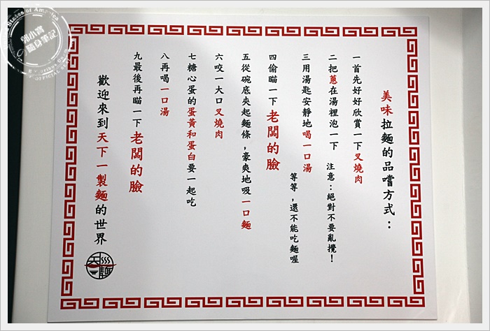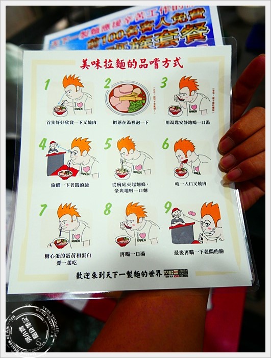 桌上還有教導怎麼吃出天下一製麵的美味拉麵方式,但是其實吃拉麵就是大口吃,愛怎吃就怎吃,不過你也可以遵從店家的方式,品嘗最道地的精神。 |