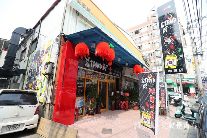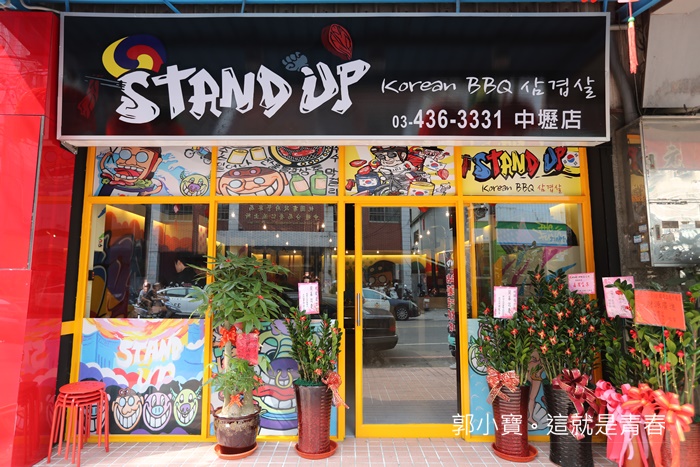 Stand Up韓道立燒桃園中壢大的地點還滿熱鬧的,同樣在中壢火車站附近靠近中原夜市,比起台中本店看起來,桃園中壢店大了許多且也較具明亮感,不變的是他們色彩豐富性相當高的彩繪感。