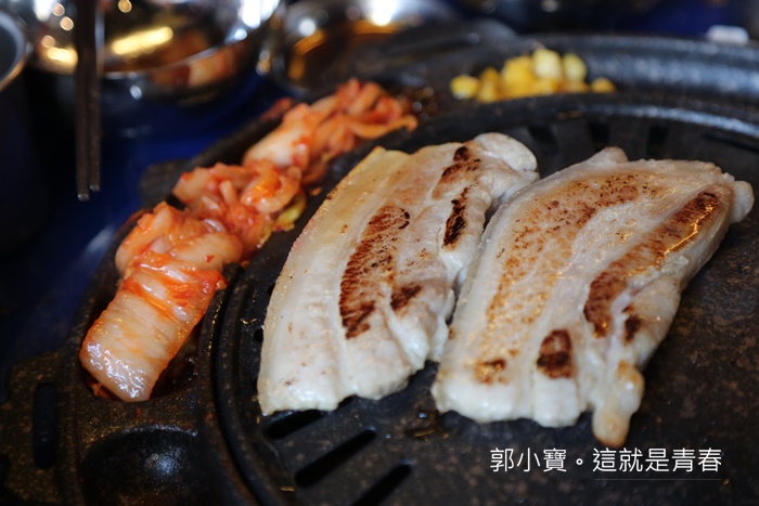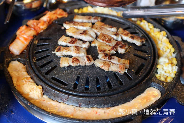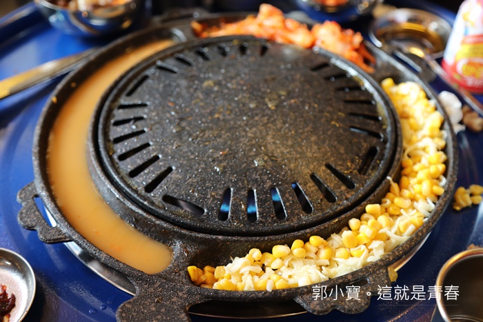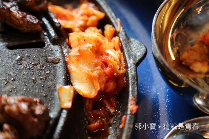 記得一個小訣竅,要注意鐵板上有一個開口,一定要面向泡菜這一邊,烤肉的肉汁會沿著開口流到泡菜,肉汁跟泡菜混合一起會讓泡菜吃起來更美味。