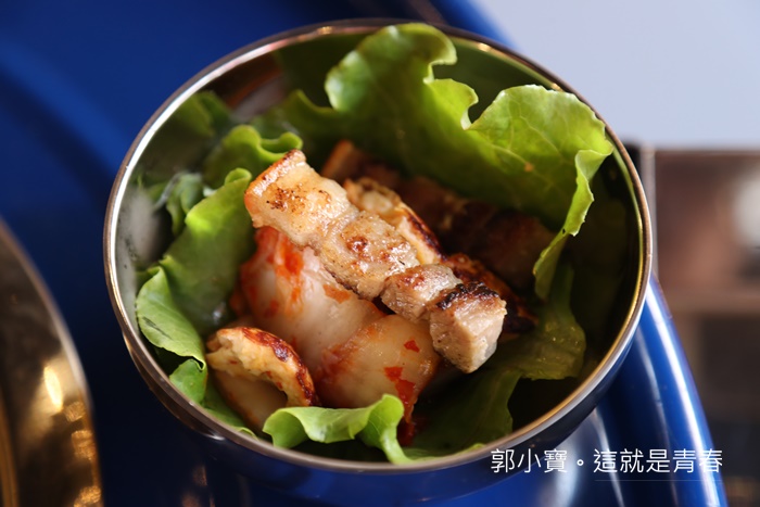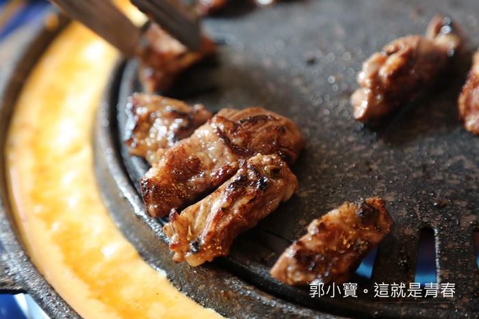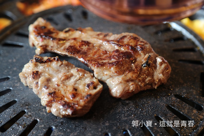 如果肚子餓的話真的比較推薦梅花豬,因為燒烤的時間也比較短,趕緊夾上一塊吃起來果然軟嫩,肉汁也相當多,還帶點蒜頭的味道,這味道真的拍案叫絕,有點像是小時候去牛排館吃牛排或是豬排的時候,店家都會把蒜頭放在鐵板再把肉品壓在上面的味道,只是這邊的味道跟香氣再濃了一些,真的真的超級好吃,不沾醬就讓人一塊接著一塊了。