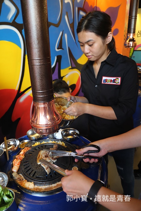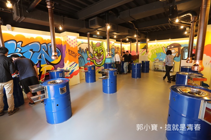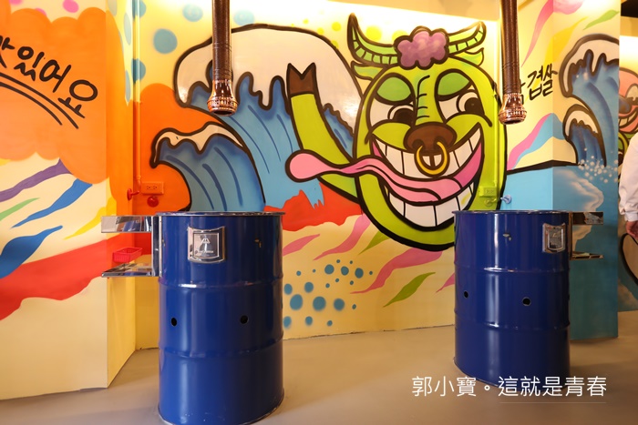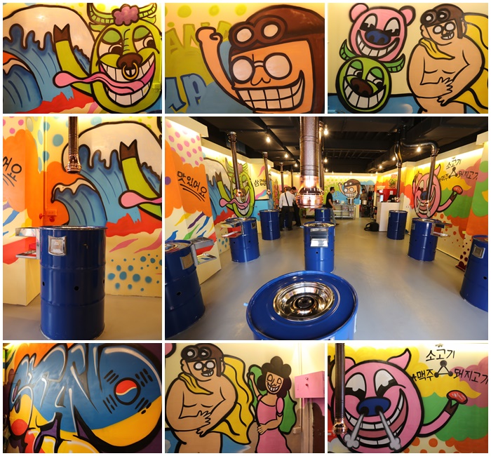 牆上大量的彩繪了鮮艷又多彩的壁畫,很年輕人的風格,沒有過多的裝潢,唯一讓人比較開心的是抽煙設備很強,加上柱形抽風再煙大的時候可以伸縮扣進烤爐,瞬間就把大量的煙霧吸走,所以吃完身上不會有過多的油煙味,加上韓國舞曲根音樂都開得很大聲,吃起來整體的氣氛相當歡樂。