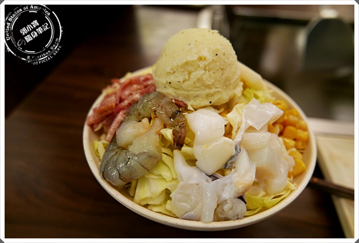 首先登場的是我們點的"月島文字燒",有花枝、蝦仁、培根玉米還有一塊年糕,上面竟然有使用一球薯泥來增加濃郁的感覺,其實配料都還是可以單點的,大家可以依照自己喜歡吃的再做增減唷 |