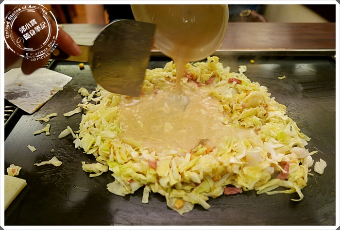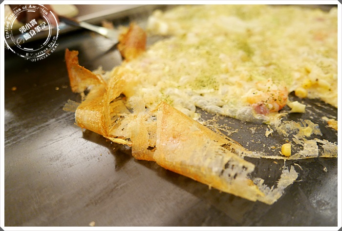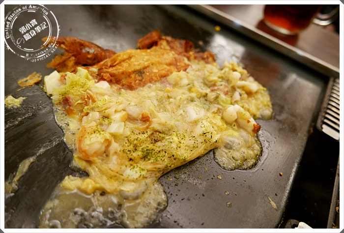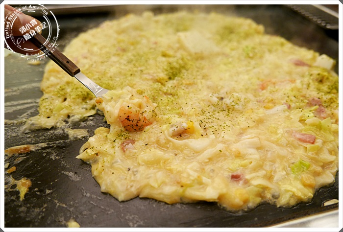 完成之後還會撒上日式海苔粉來提味,實在是太香了!使用小鏟子慢慢的刮起來慢慢吃,非常適合去聊天或是聚會聊天,但要小心真的很燙唷!還可以在撒上自己喜歡的粉狀酌料,寶妹狂撒海苔粉跟七味粉,我們還有選擇添加起士來增加香濃度,整個每一口都是濃郁感。 |