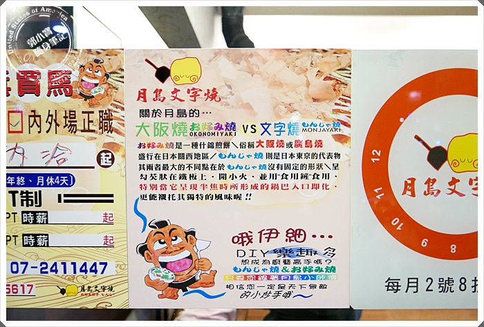 門口上面就有文字燒、大阪燒的不同特性講解,對於沒有吃過的朋友可以稍微解惑一些,後來吃完結帳的時候寶妹還想說怎麼金額少了點,仔細一看才發現原來剛剛好是一個月一次的折假日XDDD還真是幸運萬分阿~~每月2號用餐都有打八折唷^^ |