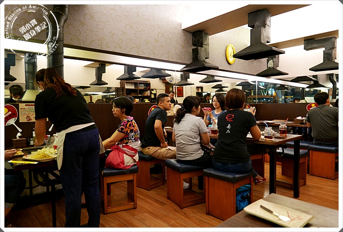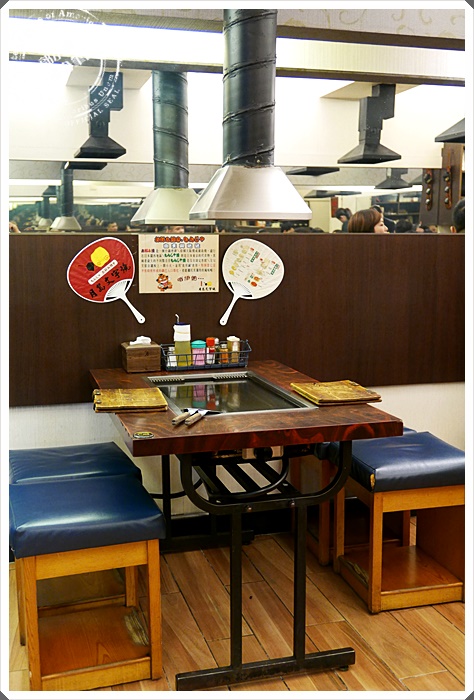 每組座位都是這樣子的,有點像是在吃燒肉XDD上面也有排煙裝置。椅子底下的框框是可以讓你放包包的喔~實在是貼心的設計! |