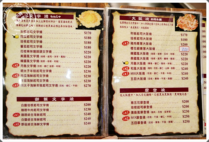 左邊是文字燒,右邊是大阪燒~左下的部分文字燒是有做其他加飯的口味,右下則是大阪燒多了加麵的不同口味。以身邊朋友吃過的狀態,第一次吃寶妹會比較建議點大阪燒先吃看看,大阪燒主要是麵糊狀製成的比較有飽足感,口感接受度台灣人普遍較高~~文字燒是使用勾芡汁,會比較薄薄的口感所以是不一樣的^^ |