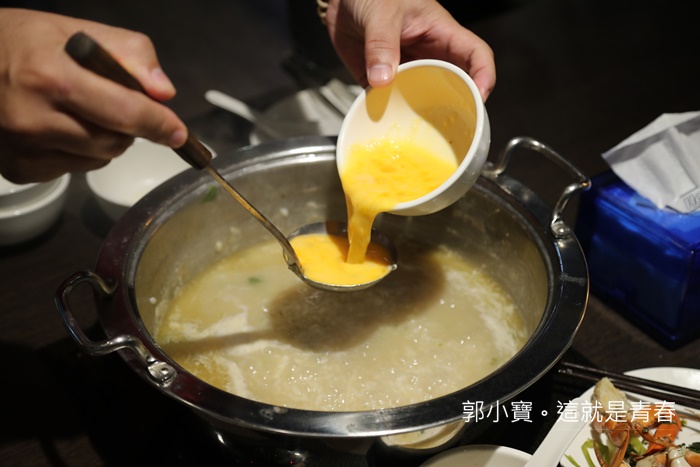 把蛋花打勻後直接倒進去鍋裡面,之前白米放進去煮了一大段時間,把米煮爛後才把蛋花倒進去,潘師傅說一定要把米煮爛在倒蛋花,蛋花布要煮太久,讓他有半熟的嫩度最好吃。 |