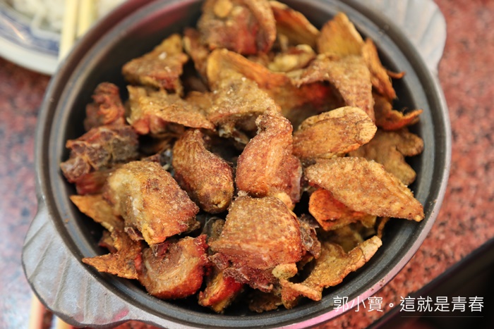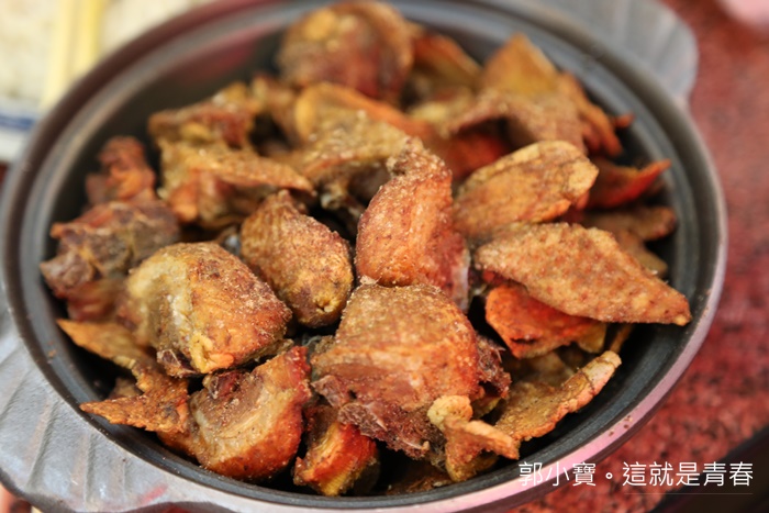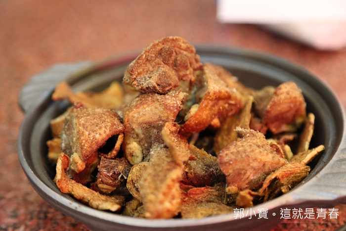 當晚我最喜歡的一道就是這個香酥尾椎,也太好吃了,本來怕鴨屁股的味道會很重,但是沒想到炸得相當的乾,那脂肪層吃起來不只毫無異味,連口感都有像肉的口感,香酥處理的水準很棒,搭配薑片也煸的很乾,吃起來像是餅乾片一樣,真的一口接一口停不下來。 |