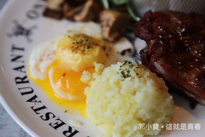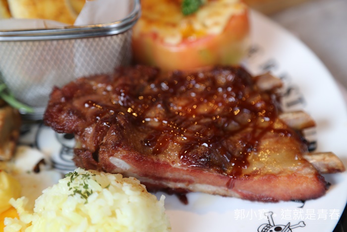 布魯克的主題套餐還滿貼切的,用麵包做出骨頭的樣子以外,還用肋排來代表布魯克,炒蘑菇搭配起司蛋,炒蘑菇熱熱吃還滿好吃的。 |