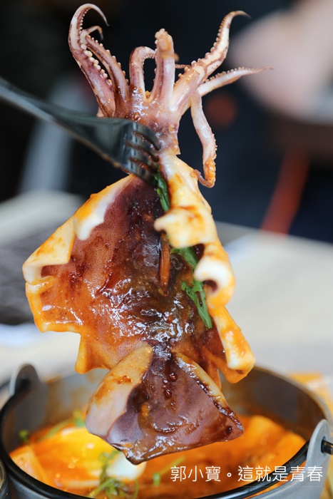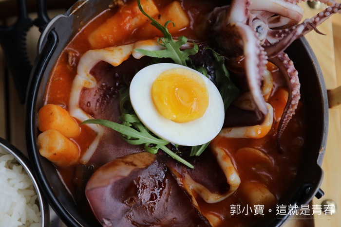 白飯搭配韓式辣鍋的套餐,主角就是人魚島上的大魷魚,其實應該是章魚@@ |
