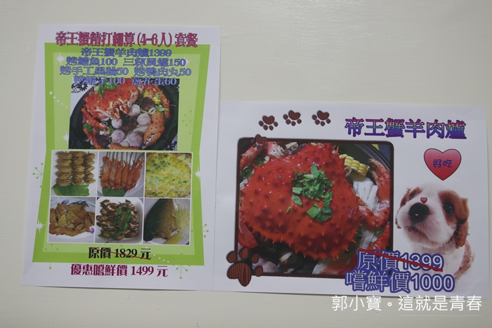 帝王蟹羊肉爐真的太有梗了,且重點一鍋才1000元也太誇張,1000元的特價只做到2016/12/31號,不趁這時候趕快點一鍋來吃真的太對不起自己了,旁邊的還加了幾樣菜色全餐也才1499,平均五個人來吃的話,一個人300也太令人感動了@@ |