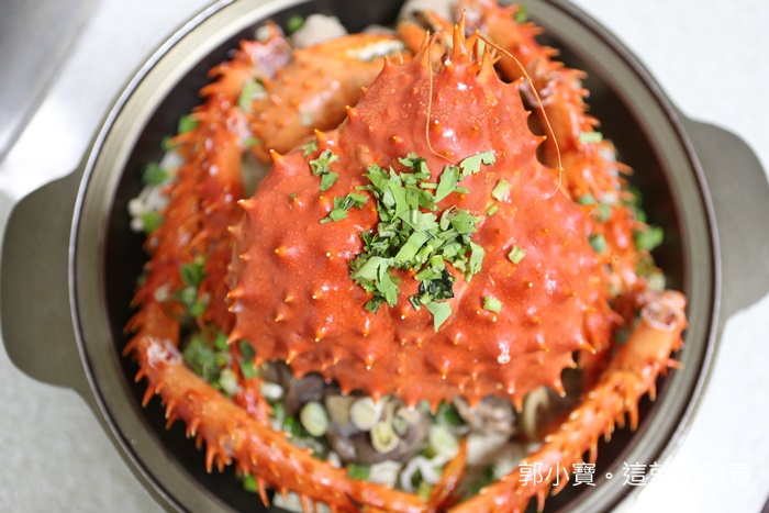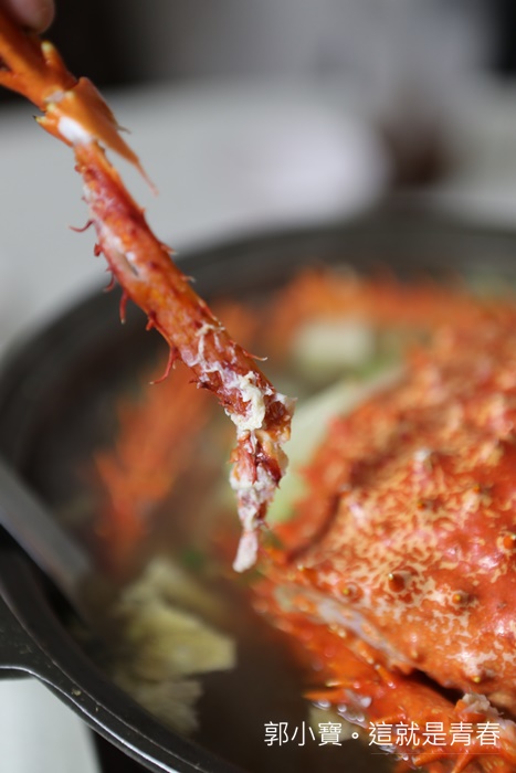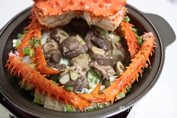 先來嘗嘗這帝王蟹腳,帝王蟹是冷凍帝王蟹,口感當然沒辦法跟活體帝王蟹比,但是他們家的帝王蟹當晚吃下來幾乎沒有空砲彈,每根蟹管都有飽滿的蟹肉,一口咬下真的就是溫暖了我的身心靈,除了蟹管肉以外,帝王蟹本身的蟹肉也很多。 |