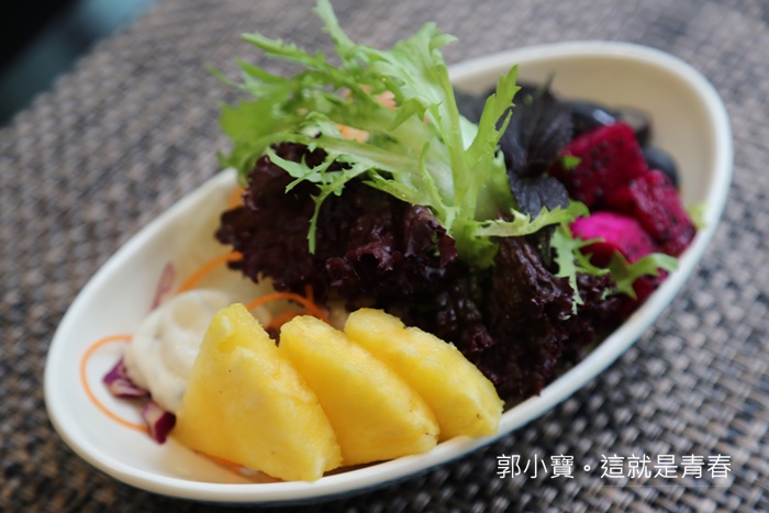 這主廚沙拉也滿威的,它們家的分量真的都滿多的,光是水果的陣容就很堅強,除了甜鳳梨以外,還有火龍果跟美生菜等,真的很重本! |
