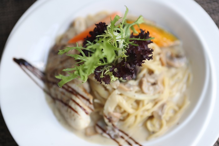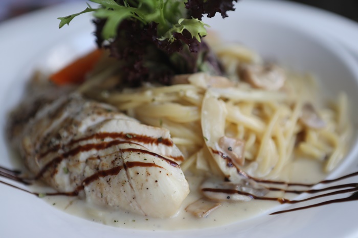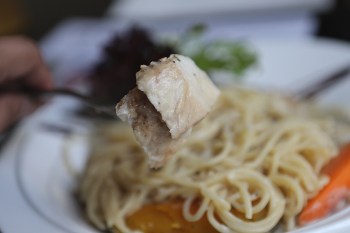 這一道算是餐廳內最受歡迎的招牌義大利麵了,用看的就夠讓我吞了好幾口的口水,不管是麵體還是雞肉的份量都相當的足,一端上來就滿滿的奶油香氣飄散。 |