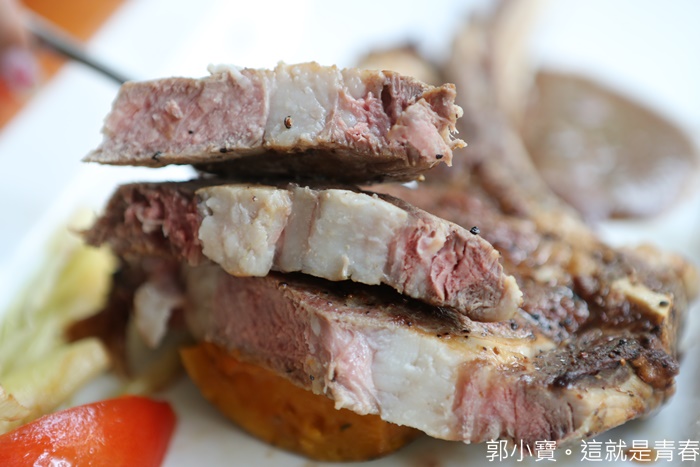 沒有吃牛的朋友我就很推薦這一到香草豬戰斧排,也是分量極重的一到排餐,厚度比牛排還要厚,重量也很沉,主廚把這戰斧豬排放進爐內慢慢烘烤才完成的,寶妹一拿起來直喊說這也太重了,偏偏又要走文青路線,真的很難想像戰斧豬排怎搭配文青路線,不過這戰斧豬排真的相當厚實,分量百分百!!!