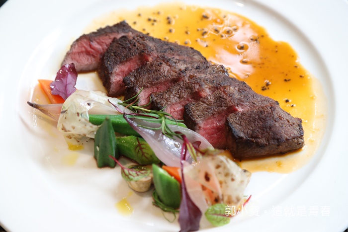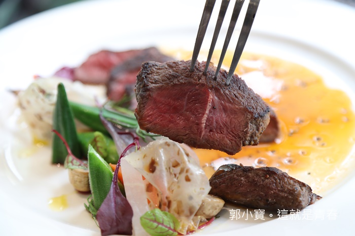 小寶我切了兩塊一起堆疊再一起,看看這厚度真的入口很過癮,油脂跟瘦肉讓你吃的是滿嘴油,牛肉相當的嫩口加豐富的油脂,吃完這一大份也不會膩,只覺得無比滿足,建議可以跟服務生要點海研,雖然廚師有搭配肥肝紅酒醬汁,但是牛肉的部分我還是比較喜歡灑點鹽提味就很好吃了,沾著肥肝紅酒醬也不錯,那帶點苦味的醬汁沾著牛肉風味層次也較多豐富。 |