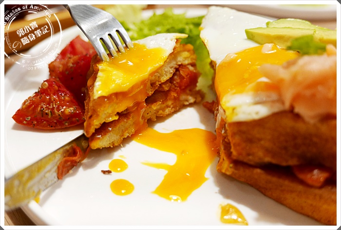 首先是紅紅綠綠西多士,這是鹹食的部分,紅色的烤番茄比較少見,裡頭還有配上半熟太陽蛋、酪梨片、煙燻鮭魚以及沙拉葉。 |