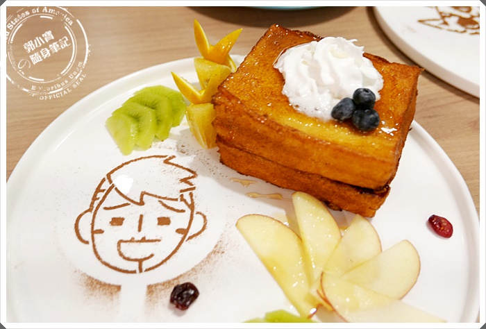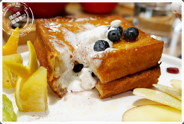 甜食的鮮果多士就連蛋奶素者也能食用,看看間的香酥金黃的超厚片西多士實在是太誘人了,鮮果多多的裡頭是夾上了藍莓內餡 |