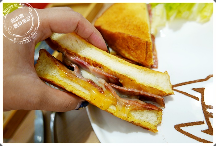 這樣就知道有多厚實了,這西多士真的好好吃,也非常合台灣人的口味,裏頭滿滿的培根以及起士,大口大口地滿足了飢餓的腸胃。 |