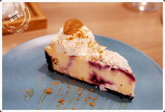 寶妹選擇的是蛋糕,一直以為會小小一個兒,沒想到還挺大塊的,選擇的是藍莓起士這種比較耐吃的口味,綿密的起士內餡正好為剛剛的正餐畫下完美的句點。 |