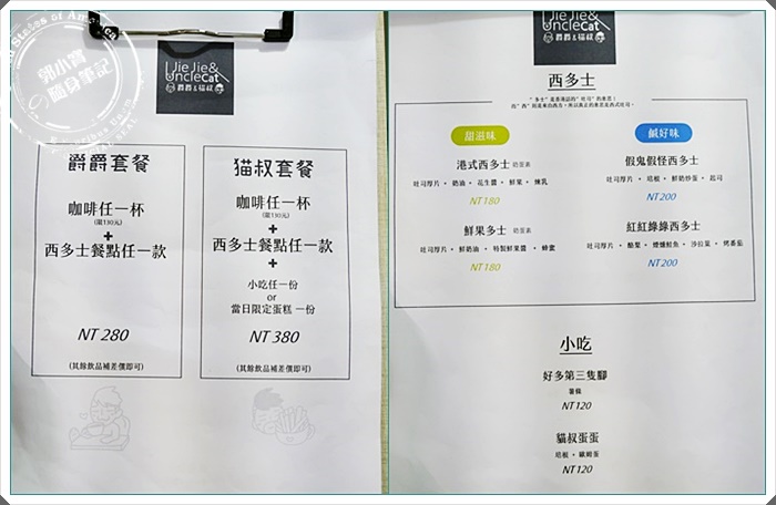 趕快來看看提供的西多士,分為爵爵套餐=飲料加上西多士式只要$280元,而貓叔套餐=飲料+西多士+小吃或蛋糕=$380元。也恰恰的分成甜鹹各兩種西多士可以選擇,而小吃有薯條以及培根歐姆蛋,蛋糕則是要看當天冰箱供應唷^^ |