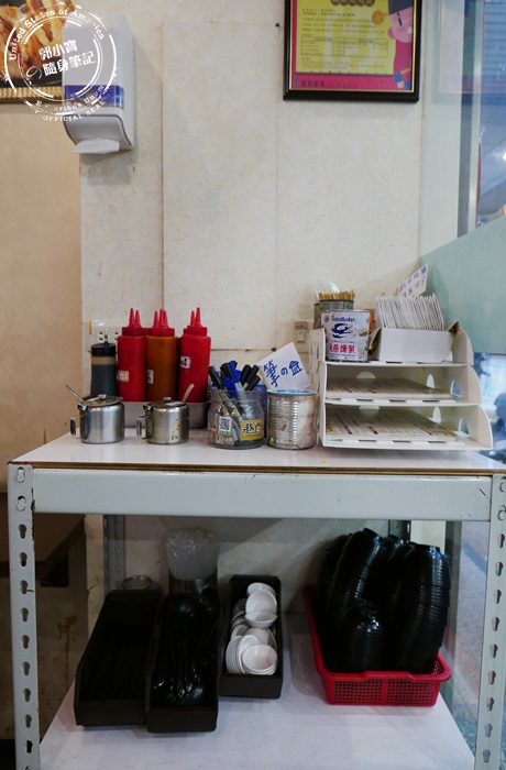 一進到店裡的右手邊,櫃子裡有擺放餐具、調味料還有菜單,貼心的還有紙摺的垃圾桶,重點還有放上一整罐的煉乳,整個滿足台灣人喜歡吃東西沾醬的習慣,所以一進到店裡面記得到這裡先拿菜單找座位唷! |