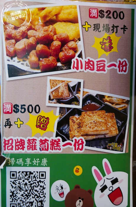 櫃檯前有很顯眼的傳單,消費滿$200再做打卡的動作就贈送一盤小肉豆,若是消費滿$500除了剛剛打卡贈送的小肉豆外,再多加贈招牌蘿蔔糕一份喔,有一種點越多吃越多的概念。 |
