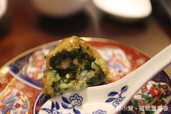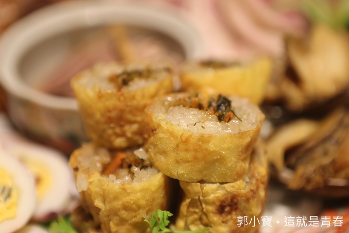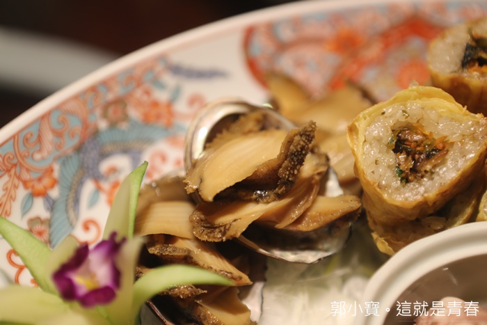 這菜品我比較印象深刻,因為大部分的山海拼盤都是搭配蝦捲,這菜品我還滿喜歡的,有底像是飯捲的感覺,外皮吃起來有點像是炸過的蛋皮,裡面是糯米包了餡料吃起來香氣四溢,滿喜歡的。 |