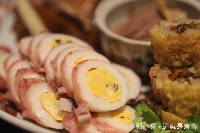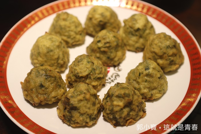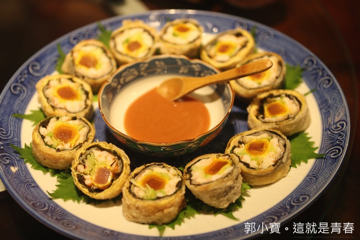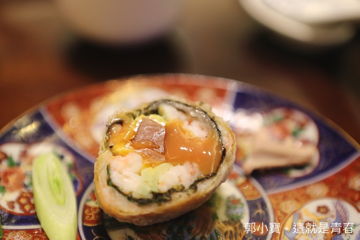 這道菜算是早期的酒家菜,其實算是很久很久很久都沒看過了,因為感覺挺費工的,仔細看了一下裡面有活蝦肉、烏魚子、鹹鴨蛋黃、豆皮、海苔片、蒜苗薄片、香菜葉等,再抹上一點蝦漿,入口的口感確實非常豐富。 |
