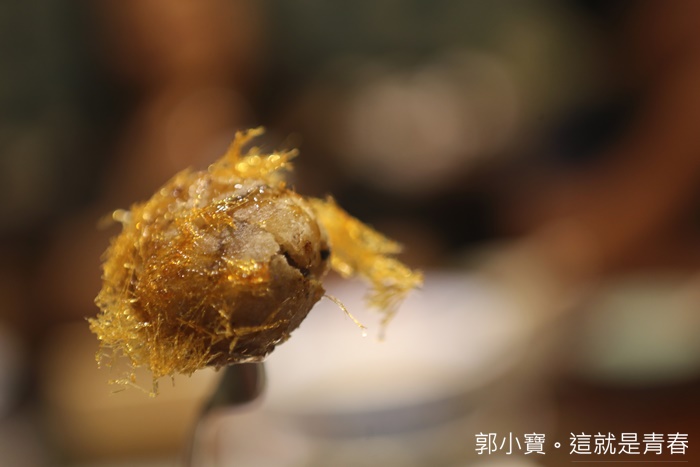 非常吸睛的甜品,基本上也算是拔絲甜品的一種,要先把拔絲金線往下壓在一顆一顆切開,芋泥球搭配拔絲滋味還真的不錯,熱熱吃很對味。 |