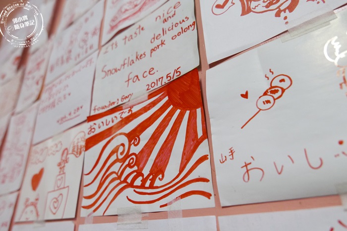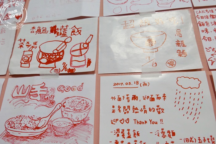 牆上很多便條紙塗鴉留言,這些都是來這家店的客人親筆畫上去的,貼滿滿的兩面牆,有些客人好有才華畫的真的很棒,也有日本人跟韓國人來這裡,用餐後的心得也會寫在便條紙上,許多人會直接在上面推薦好吃的餐點,所以如果第一次來不知道要吃什麼,而且老闆娘又很忙碌沒有人可以詢問,倒是可以參考這些過來人的經驗,就比較不容易踩到地雷,連客人的塗鴉都這麼的有日本風味,看到這些作畫才有感覺到我在日式餐廳。 |