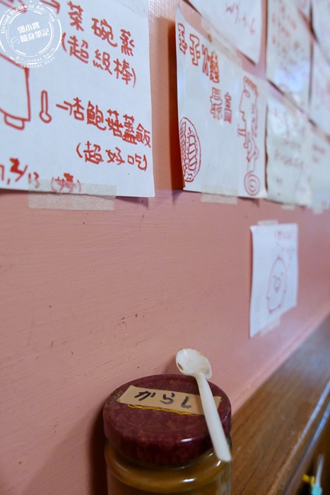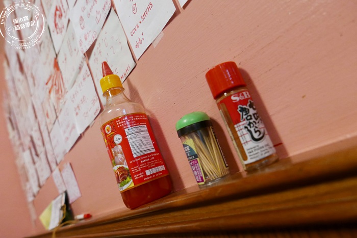 店裡的空間真的蠻狹小的,桌面的大小已經無法放置太多的東西,所以很妙的這些調味料,全部都放在店家裝潢靠牆面的平台,平台的面積其實不寬,放上一瓶調味料也差不多佔滿了,有種挺克難的感覺,不過這些調味料艾編人這次都沒有試到,給有興趣的朋友們自己來嚐嚐看囉! |