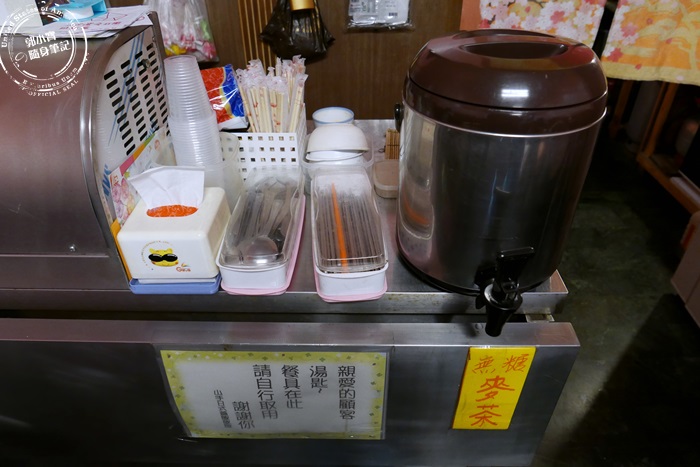 靠近廚房這個櫃子的小小平台,有提供冰的無糖麥茶給客人飲用,碗筷餐具紙巾通通放在這裡,要自行取用喔!因為空間很小的緣故,想要來拿這些餐具,路途感覺蠻遙遠的還困難重重。 |