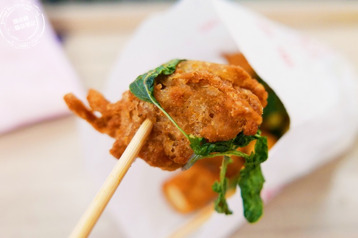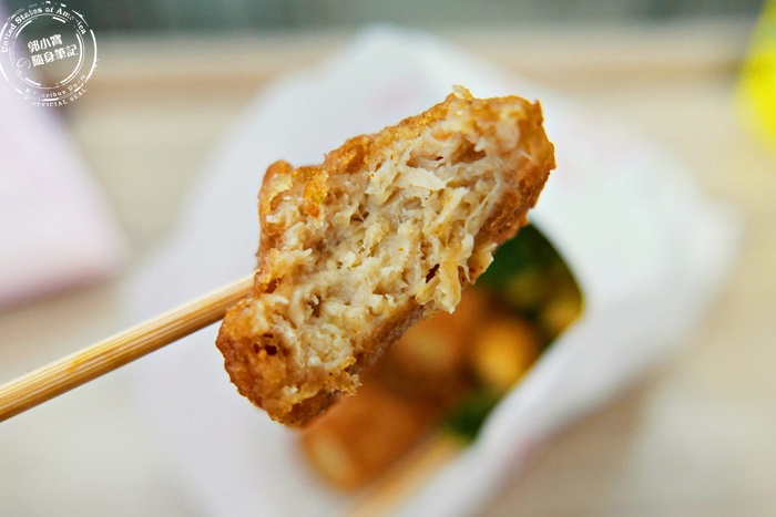 素蝦卷跟吃黑輪的口感類似,相當的軟Q有嚼勁,外衣炸過的酥香,咀嚼中釋放出來的香氣與甜味,口感沒有剛剛的素鹹酥雞那麼有嚼勁,所以不用太費力氣去咀嚼,越嚼越香,老闆娘大力推薦的果然很好吃。 |