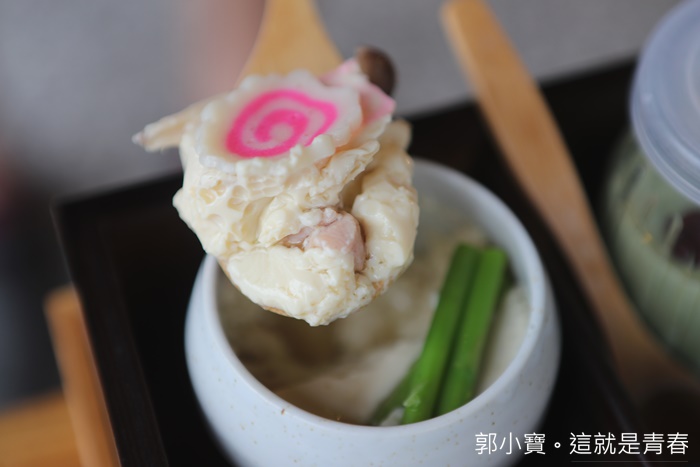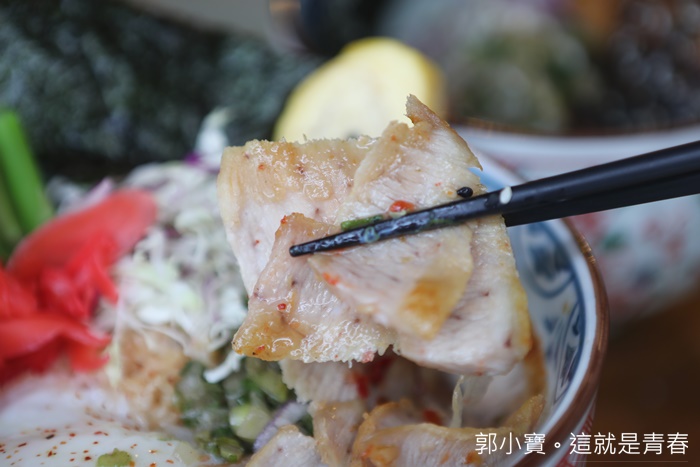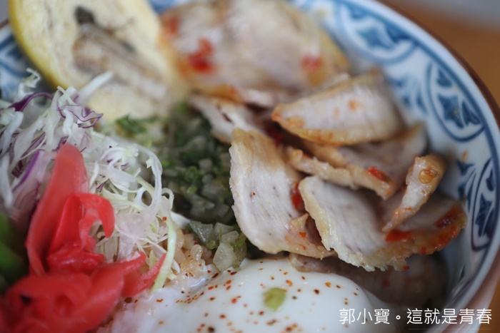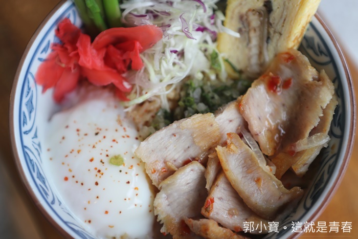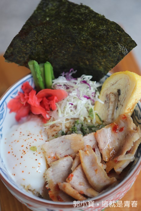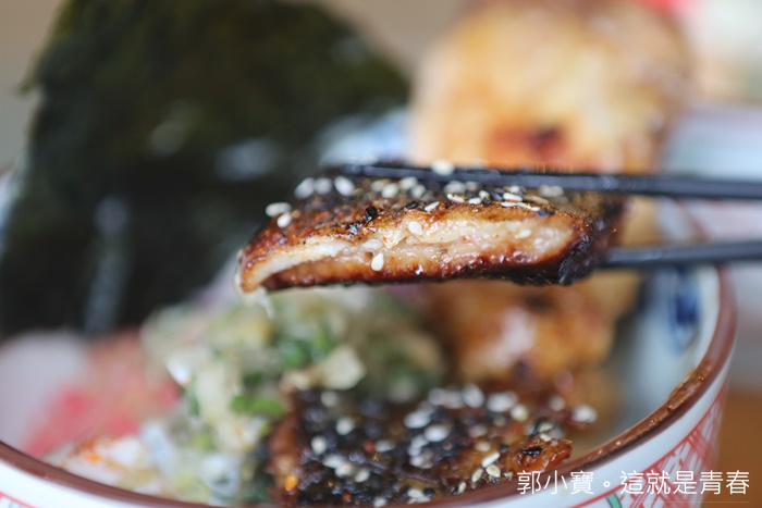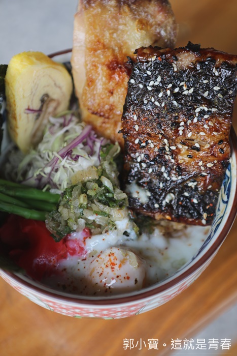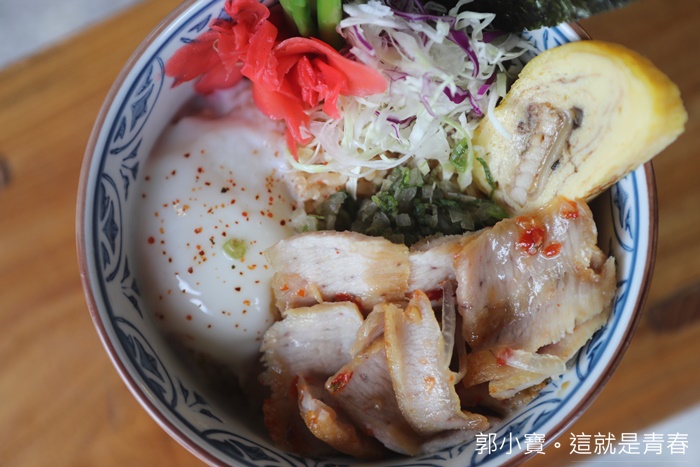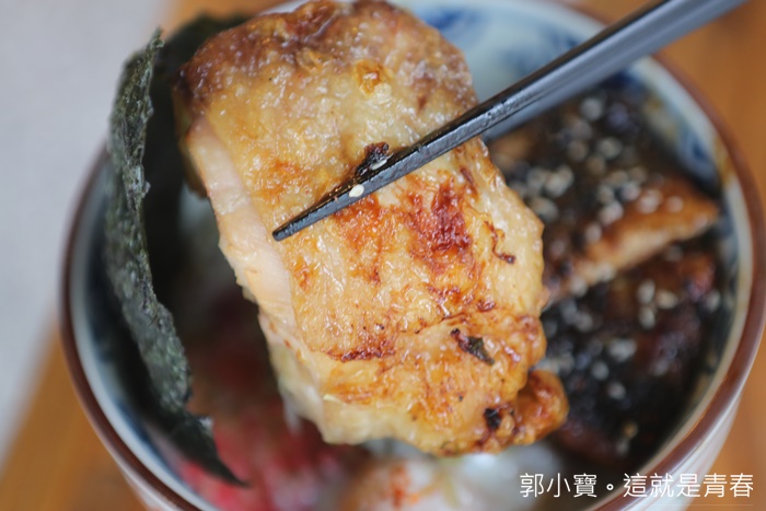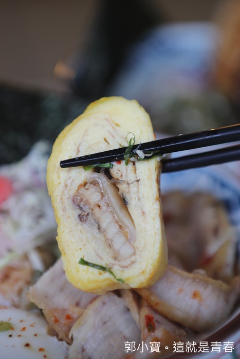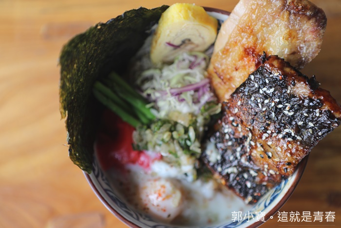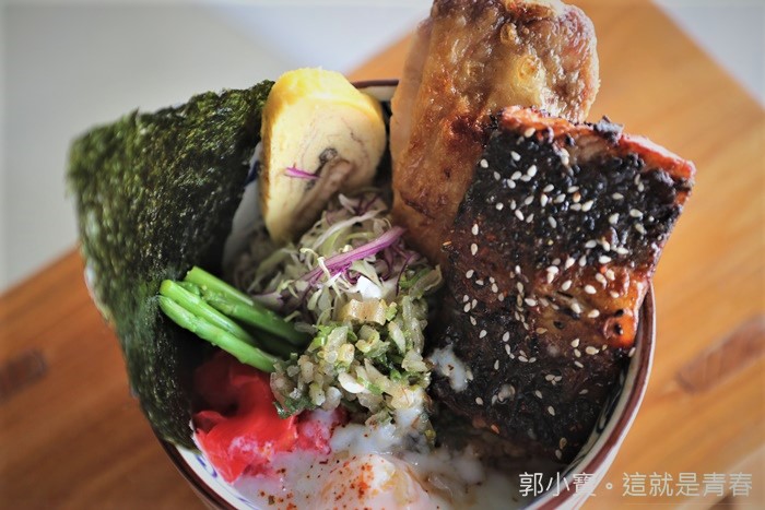 配料幾乎要占據整個碗面了,除了一大塊的鰻魚跟雞腿排以外,還有鰻魚蛋捲耶,裡面還有蔥鹽可以搭配雞腿排,生菜絲跟蘆筍、重點重點還有一顆滑嫩的半熟蛋,看起來一整個就是豐富到不行,這樣換算下來其實它們家的雙拼丼其實也不是很貴,鰻魚跟雞肉都是台灣本土的優良肉品,不是使用一般很多人用的進口雞肉以外,還有鰻魚蛋捲跟現點現烤的木炭香味,真的非常值得。 |