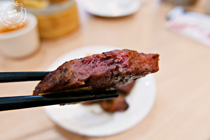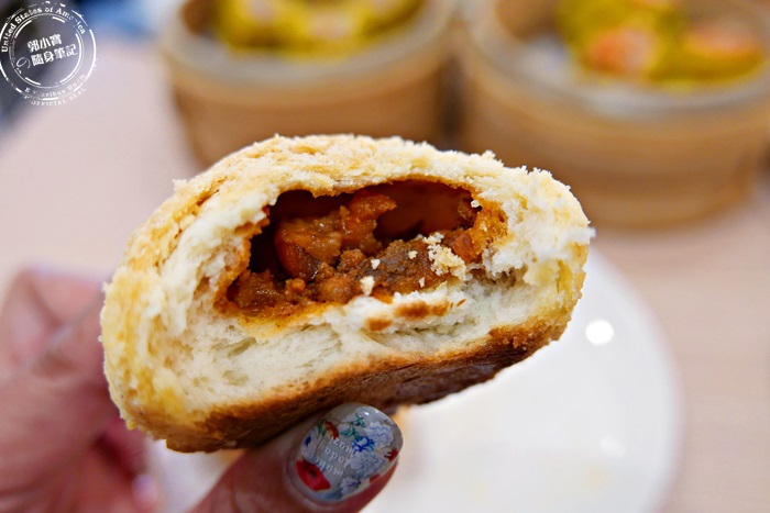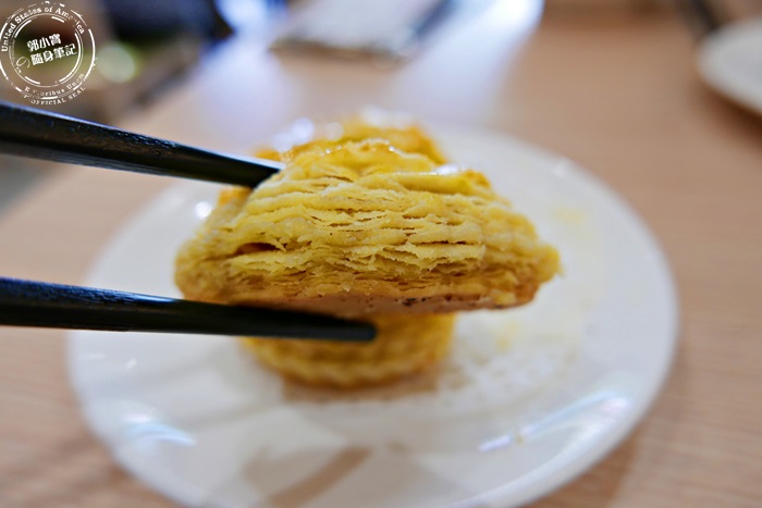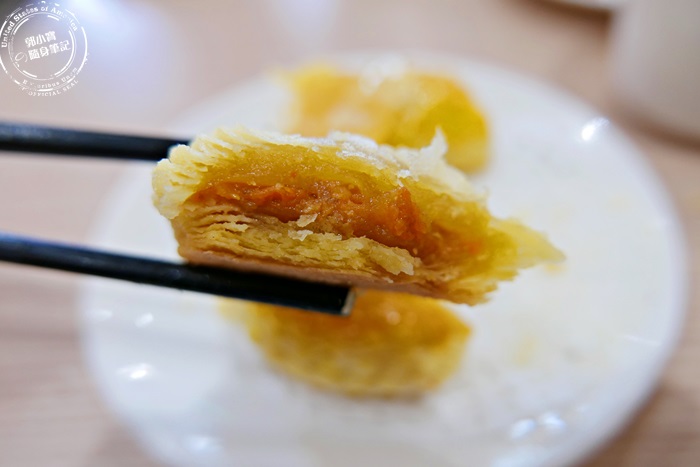 層層的酥皮隱約可見裡頭的叉燒餡,這種酥皮烤的叉燒酥,剛烤好的味道超香,這除了是港點,其實也能當甜點,因為現烤的需要時間,所以最後送上來當最後一道的甜品,也是挺不錯的喲! |