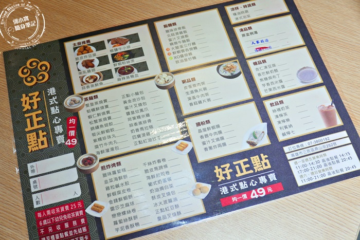 菜單就是以點心居多,也有分類,幾乎所有的港點這裡大致上都有提供,均一價$49真的非常便宜,來這裡吃的滿足也不傷荷包,許多港點的價位其實都貴到爆,這家主打49元太吸引人,還不另收服務費,只有收茶資每人$25,相當合理,感覺點越多省越多,不是吃到飽也能吃很飽,高雄有這麼一家平價港點,真的是太幸福啦! |