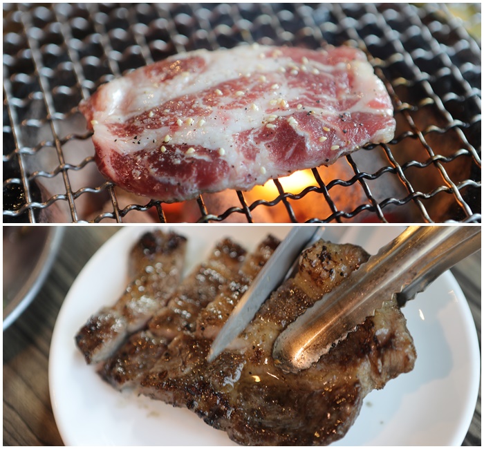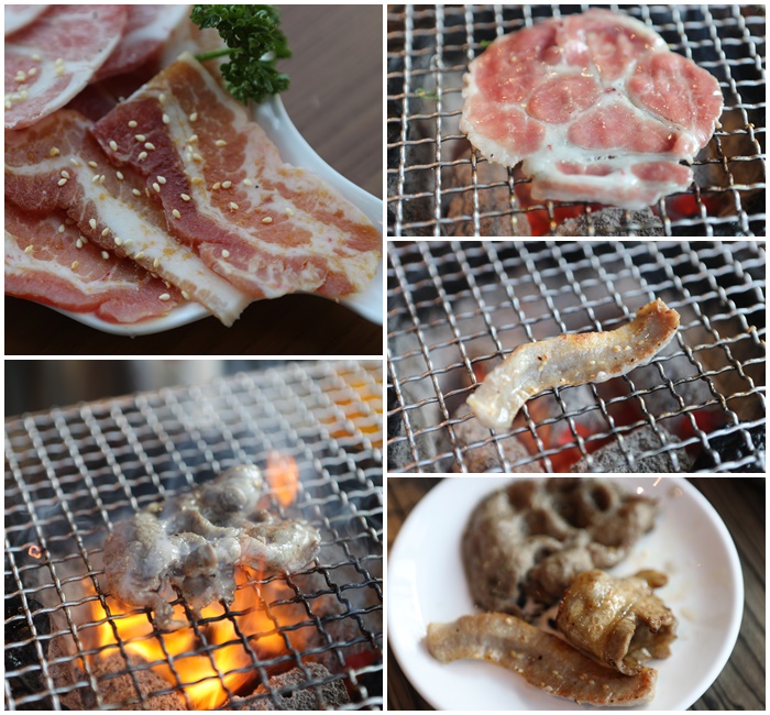 以台灣造型的盤子放了三種豬肉,算是豬肉盛合,裡面分別有豬頸肉、豬五花、上等豬五花三種肉品,分量給的滿多的,豬五花烤的時候很容易發爐,但是這種烤爐真的比較方便,烤網邊邊不會燙手,非常大火的時候還可以方便移動,烤網的部分服務生也換得很勤勞。 |