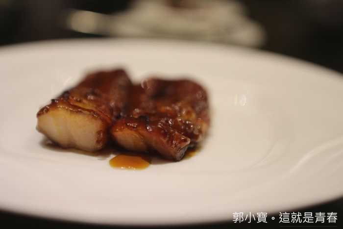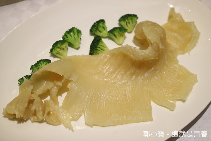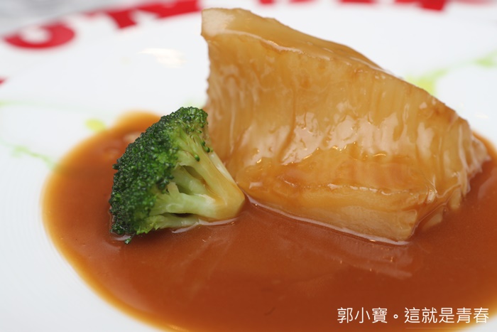 當天晚上最奢華的一道料理,在廣東菜料理裡面很常看到但是卻不常吃,因為價位真的太昂貴了,重點是這種達八兩的花膠本身就非常少見,花膠是魚腹的部分不是魚翅,雖然看起來很像,將這肥美的花膠跟熬煮的鮑魚汁混合一起,光用看的就夠讓人流口水了。 |