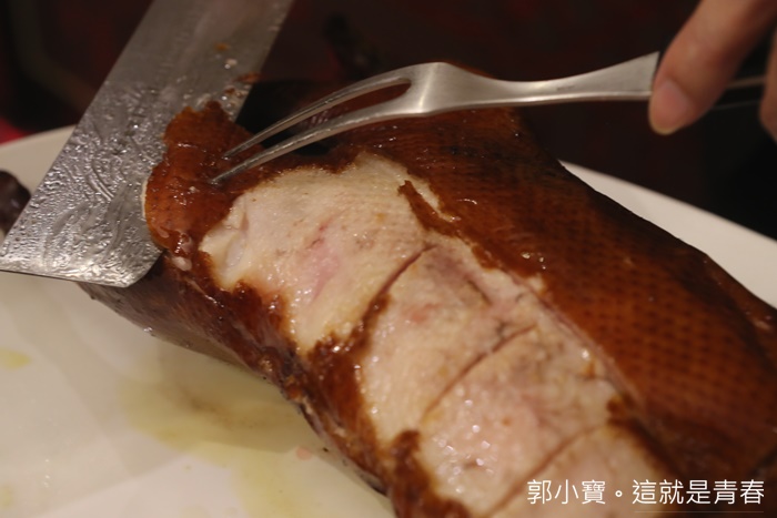 烤鴨功夫巧妙也是家家不同,不只醃料還有烤法也都不相同,但是龍廷的片皮鴨師傅倒是少見的標準,那小心又快速精準的只片出鴨皮的功夫真的不是蓋的。 |