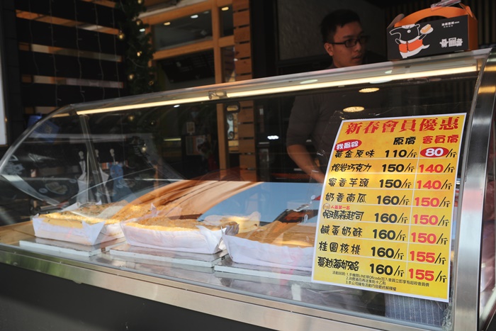 仔細的看了一下總共有八種口味,每一種感覺起來都很好吃,尤其鹹蛋奶酥感覺就很特別,八種口味有兩種是鹹的六種是甜的,外帶的紙盒需要多加10元,這邊的古早味蛋糕都是以斤論,大部分的古早味蛋糕好像都是以斤論價,黃金原味一斤80元一整個就是超值,CP值也太高了吧,難怪可以吸引那麼多人潮來排隊購買。 |